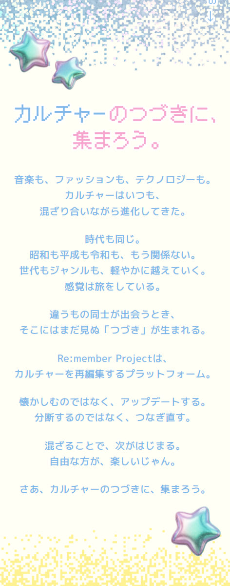 Re:member Projectは、カルチャーを再編集し、新しい文脈や体験を生み出す共創プロジェクトです。音楽、ファッション、テクノロジー、食、街など、異なるカルチャーを掛け合わせながら、世代やジャンルを越えた新しい価値を生み出します。