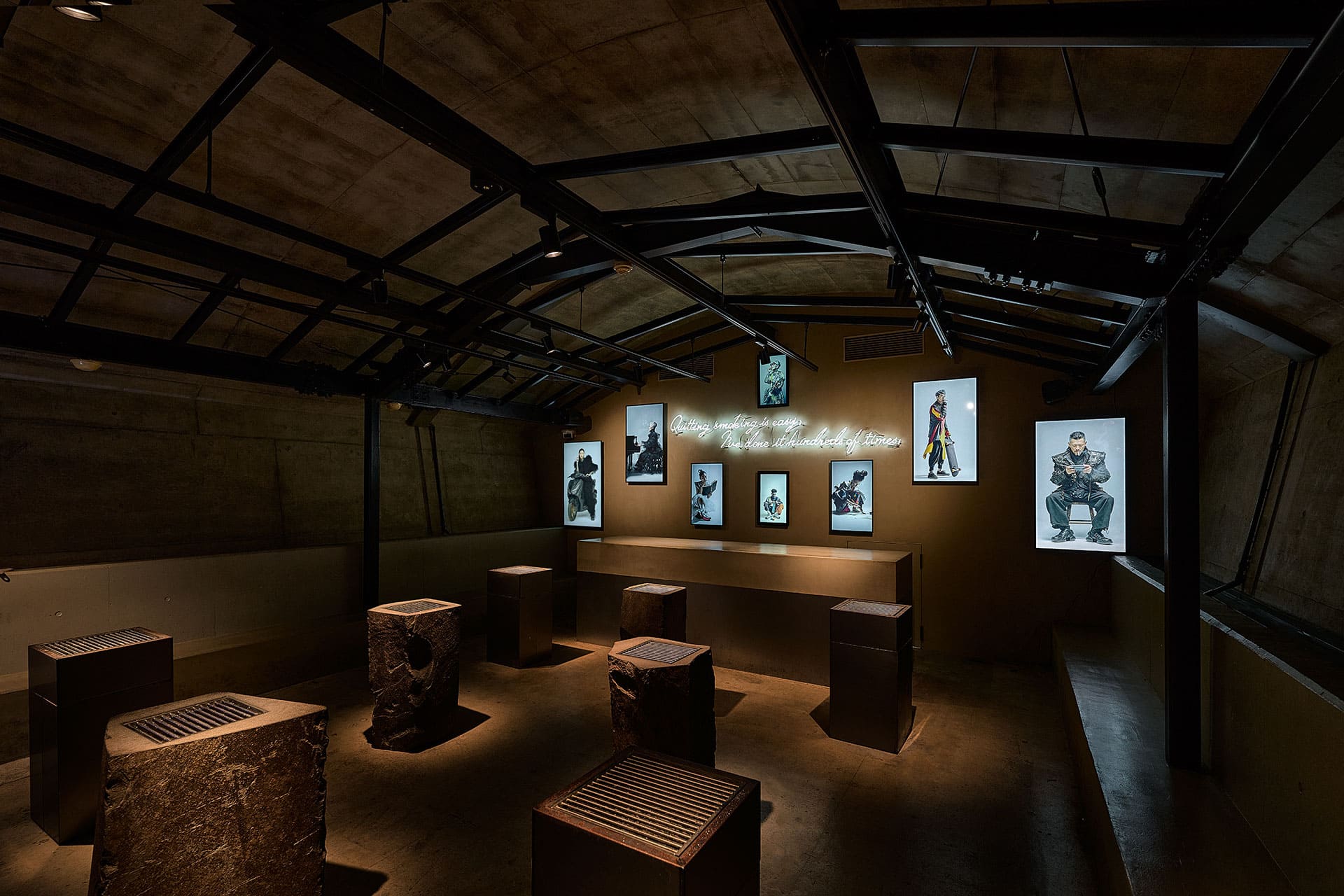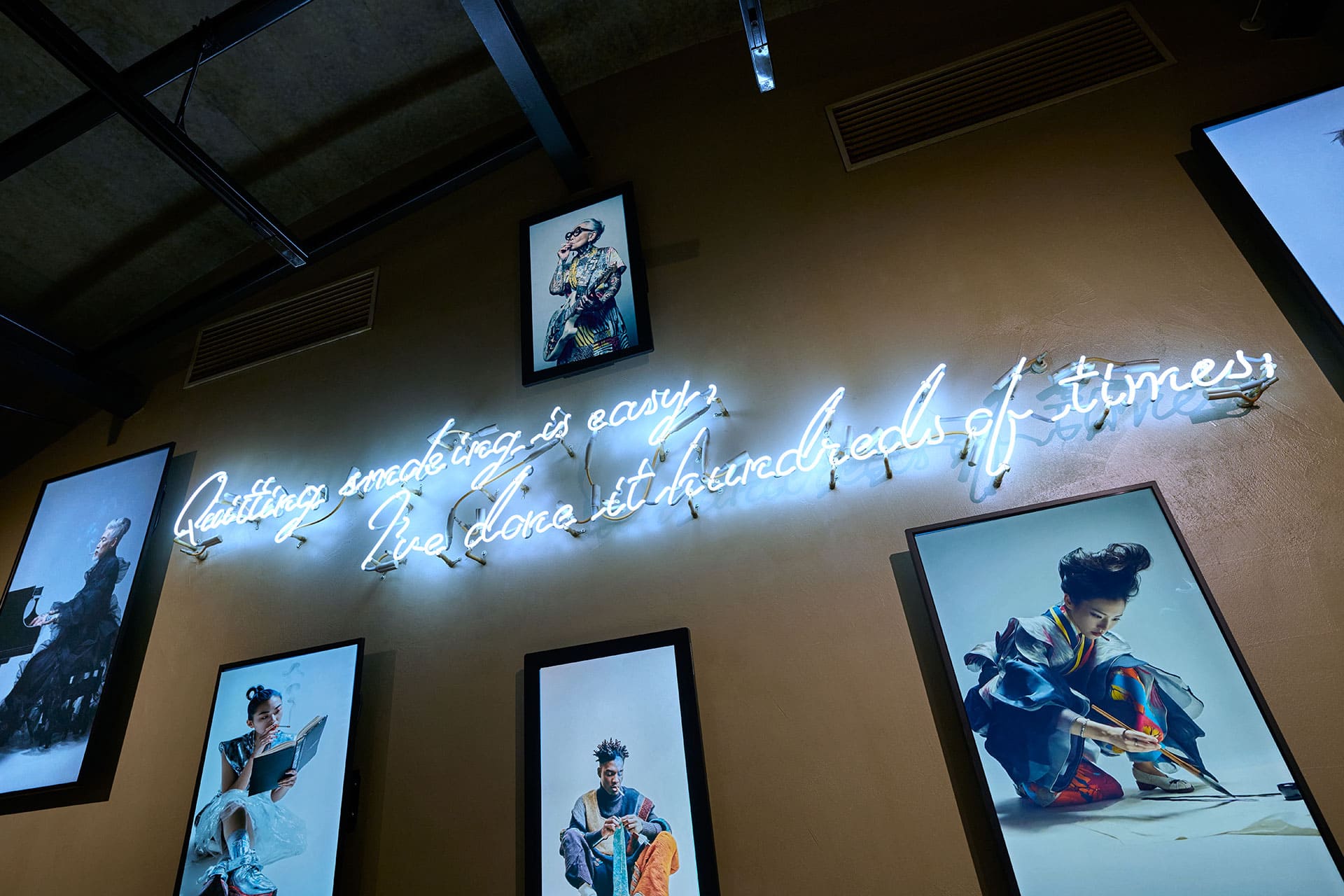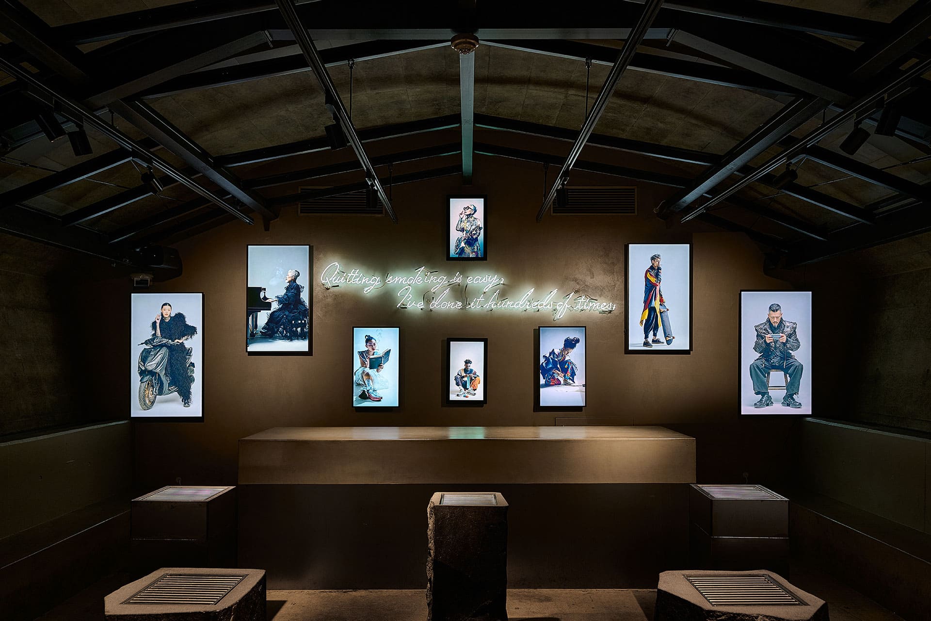 私たちの営みを満たす“ながら”というささやかな風景。喫煙に関する法令が変わって以来、“タバコを吸いながら”の時間は街から少しずつ姿を消しつつあります。その記憶にそっと触れるように、映像の中には編み物をしながら、ギターを弾きながら、本を読みながら――といった日常の断片を描写。8枚のモニターを小さな窓のように配置し、AIが紡ぐ営みの気配を空間に呼び戻しました。映像は利用者の呼吸と重なり、硬質なデジタルが光の素材として建築と響き合う“ひと息の時間”へと変わっていきます。近未来的キャラクターのIP設計を含む世界観づくりを通じ、リアルとデジタルが溶け合う体験を形にしました。